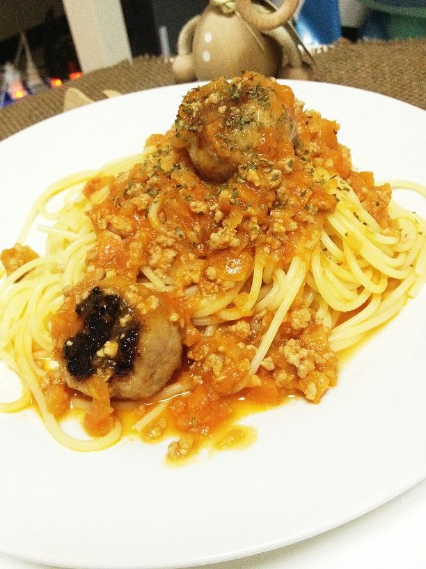 同じひき肉でお弁当用ハンバーグを作り、二つだけミートボールにしてパスタにトッピング!