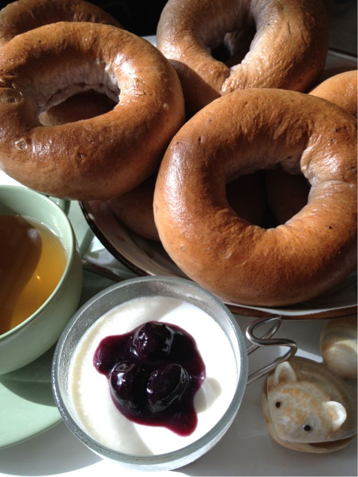 焼きたてのベーグルと、ブルーベリーをかけたヨーグルトムース、