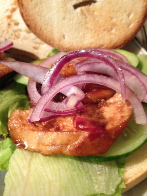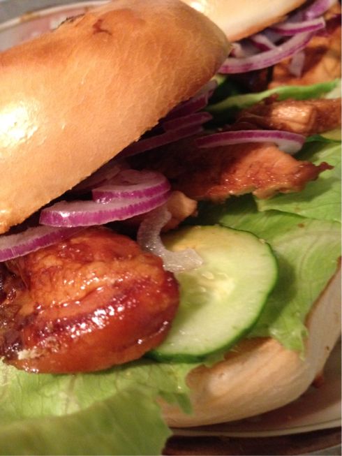 石井とマルイチのベーグルで照り焼きチキンサンドです。