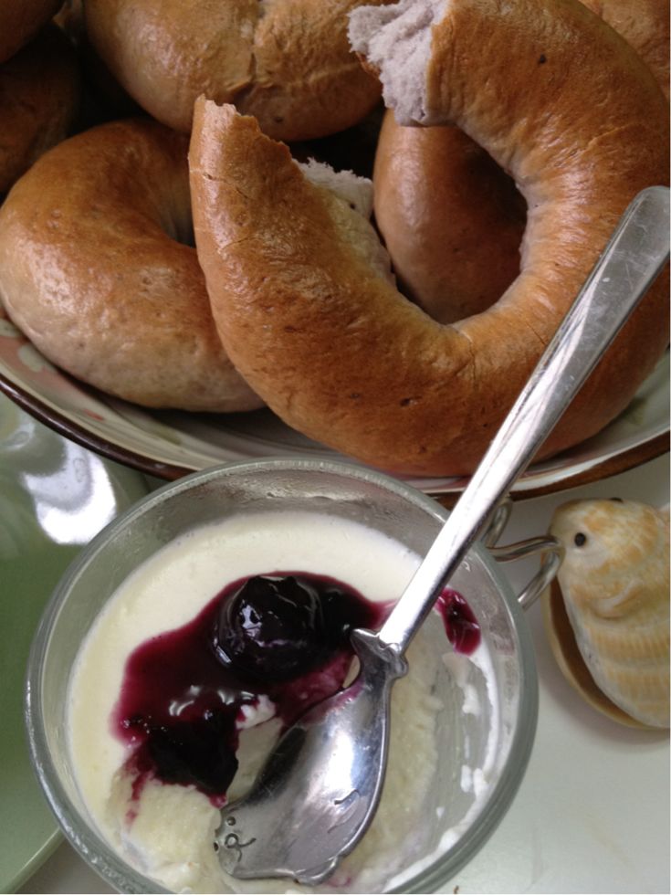 焼きたてのベーグルと、ブルーベリーをかけたヨーグルトムース、