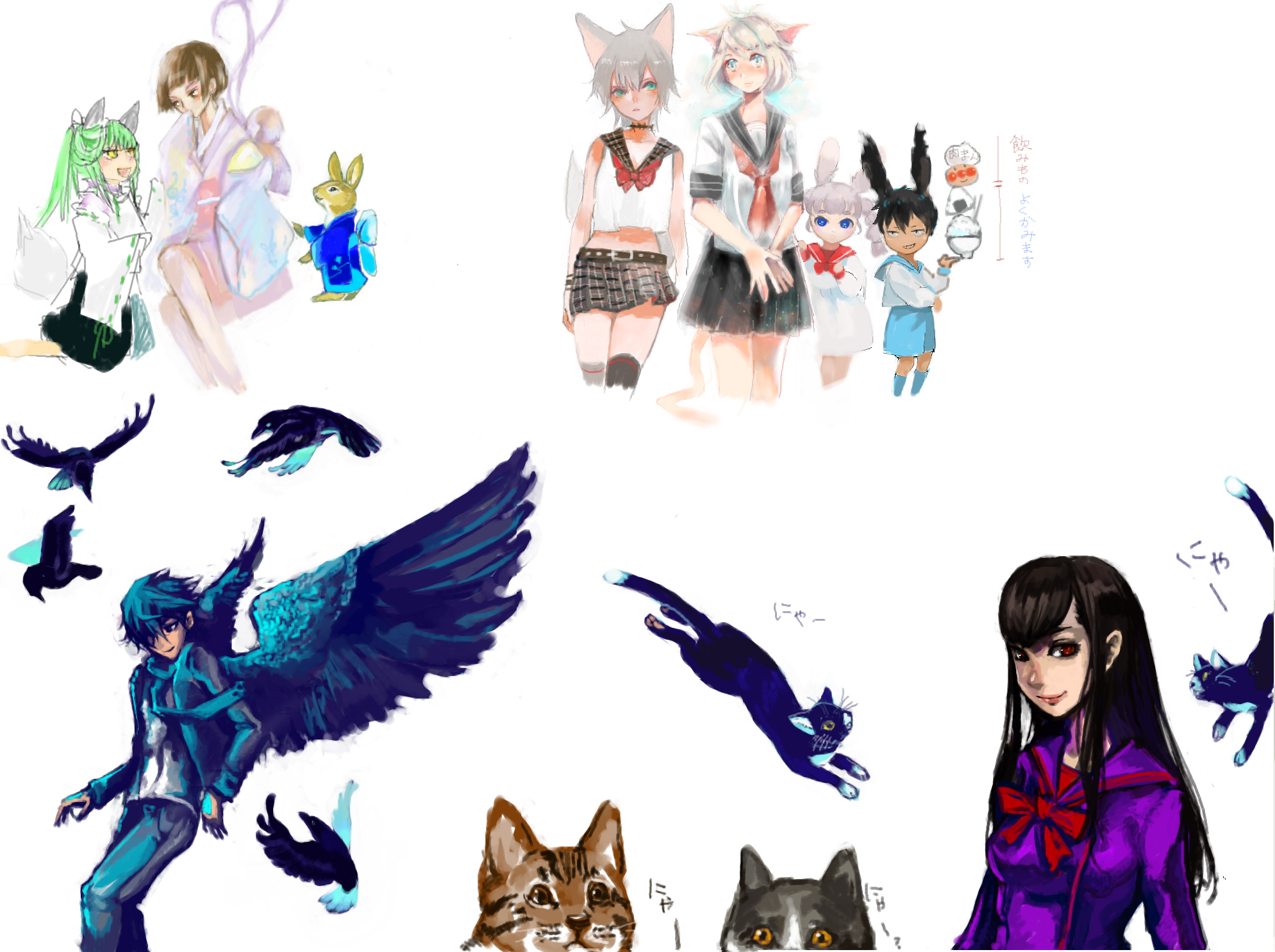和服と、セーラー服と獣耳と、鳥と猫です。